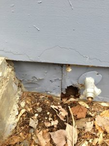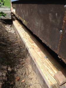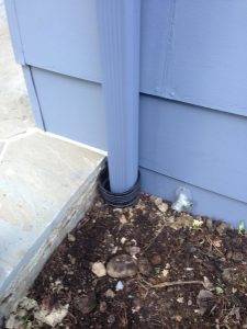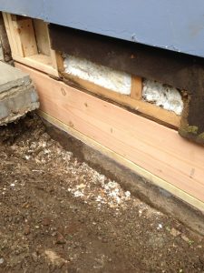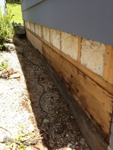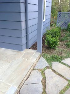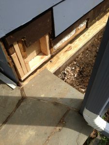Water damaged mud sill area of the home needed to be repaired. I removed and replaced all the damaged areas and redirected the downspout away from the house. Sikaflex® Self Leveling Sealant was used to seal the blue stone to the exterior wall.